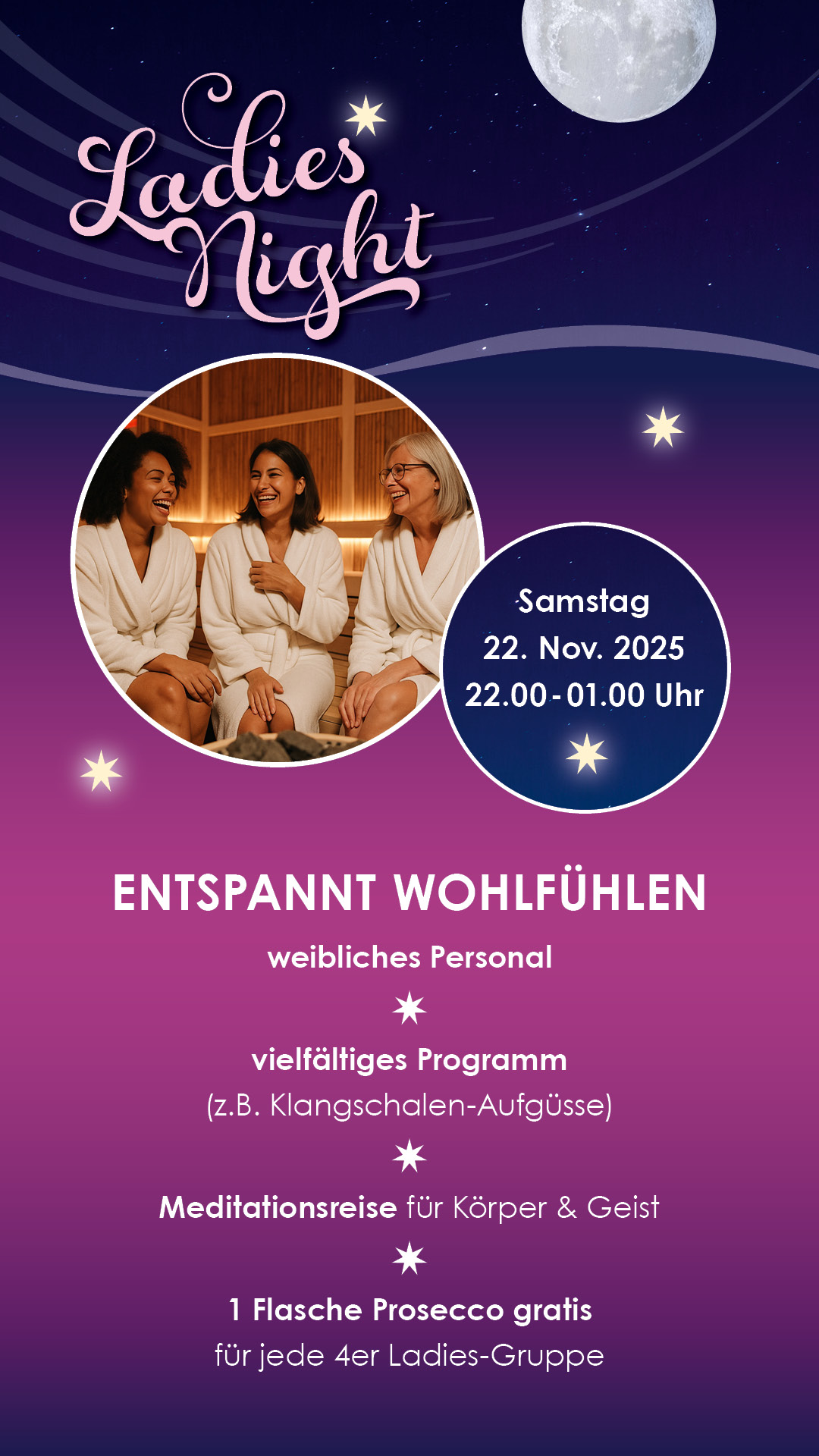 Genießen Sie eine exklusive Auszeit ganz unter Frauen bei unserer Ladies Night am 22. November ab 22.00 Uhr.