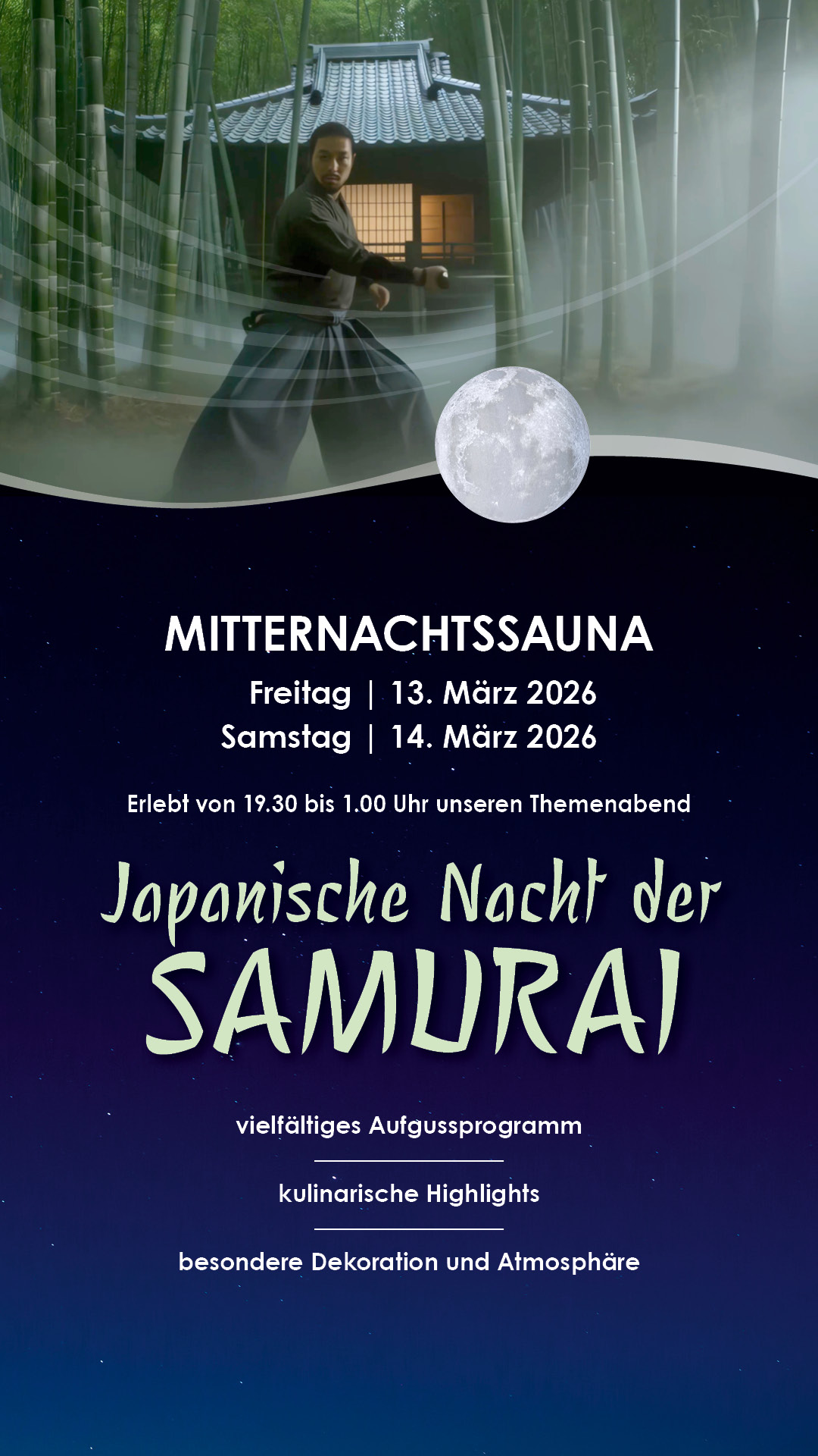 Lassen Sie sich entführen in die Welt der Samurai bei unserer Mitternachtssauna unter dem Motto Japanische Nacht. Freuen Sie sich auf besondere Aufgüsse, fernöstliche Aromen und eine Saunalandschaft, die im Zeichen der japanischen Ästhetik gestaltet ist.