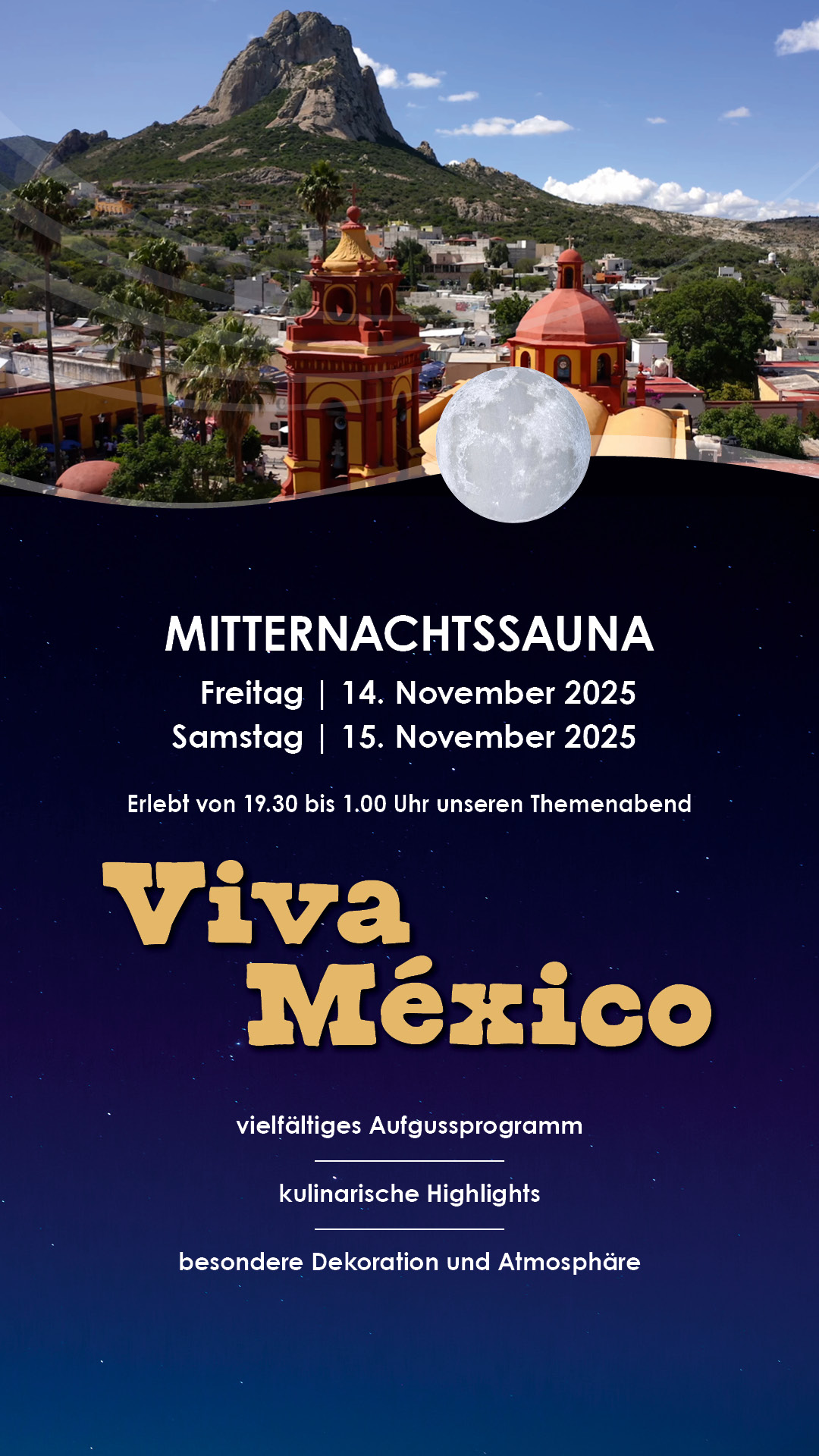 Entfliehen Sie dem Alltag und begeben Sie sich auf eine sinnliche Reise nach Mexiko – bei unserer nächsten Mitternachtssauna unter dem Motto „Viva México“.