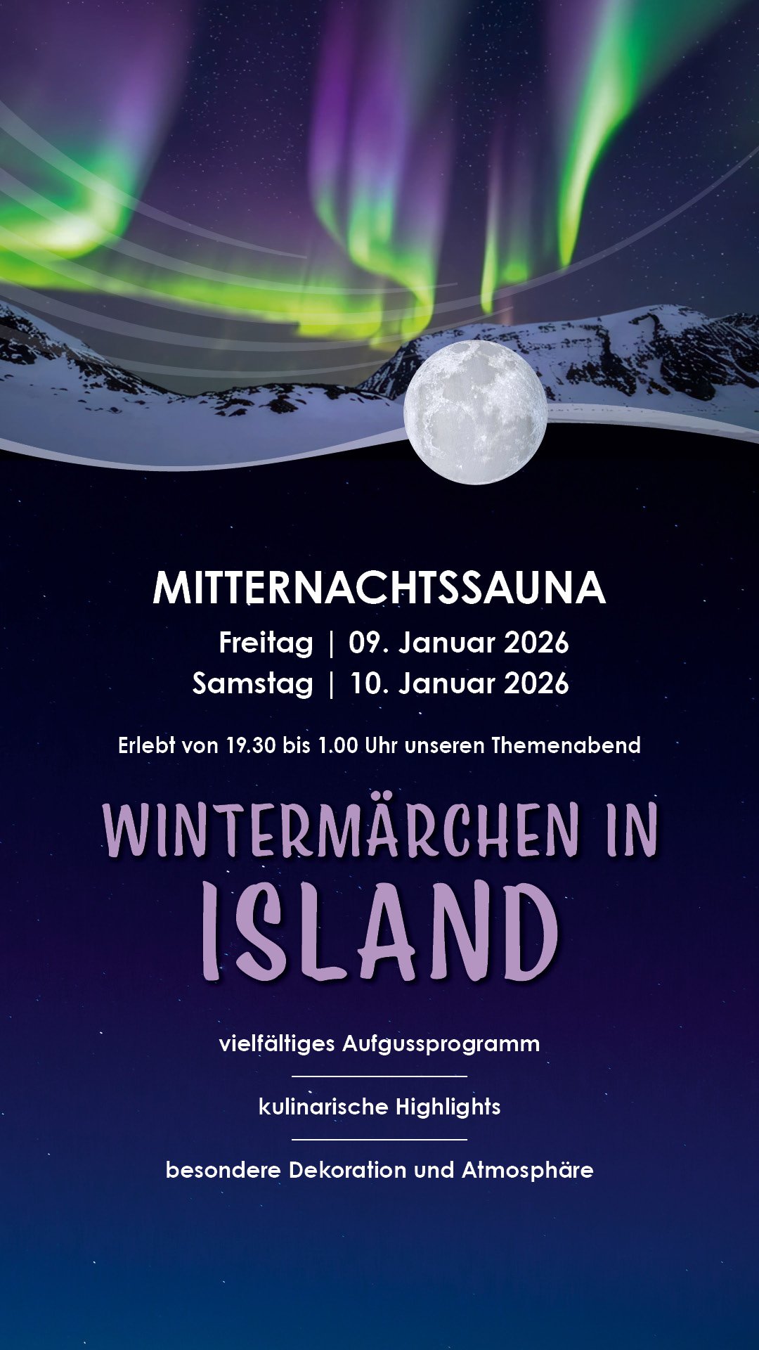 Erleben Sie einen magischen Saunaabend voller nordischer Stimmung: Polarlichter, eisige Farben und stimmungsvolle Dekoration entführen Sie in die mystische Welt Islands. Freuen Sie sich auf fantasievolle Aufgusszeremonien mit isländischen Düften, sanfte Klänge und entspannende Rituale – inspiriert von Geysiren, Fjorden und nordischen Legenden.